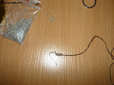 Начинаем изготавливать серьги из пайеток и бисера. нанизываем на нитку 10 бисеринок. Затем просовываем иголку в первую бисеринку, у нас получается петля. Эту петлю надеваем на швензу.