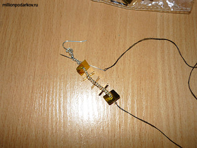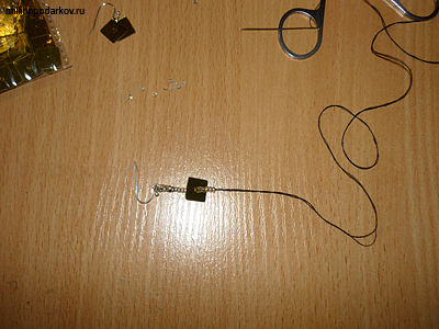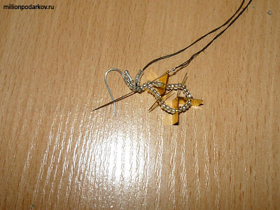 Делаем две петли в виде узора из 5 бисерин. Завязываем узелок. Сережка готова. Проделываем то же самое и со второй серьгой.