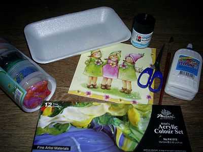 Итак, для того чтобы сделать декоративную тарелочку, приготовьте такие материалы, как пенопластовая упаковка, салфетка с рисунком, лак, клей ПВА, шариковый пластилин, акриловые краски, кисточку и ножницы.