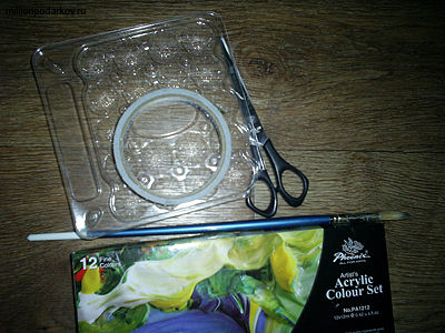 Для того чтобы сделать открытку, мы использовали такие материалы, как упаковка от перепелиных яиц, прозрачная пленка, двухсторонний скотч, ножницы, акриловые краски, кисточка.