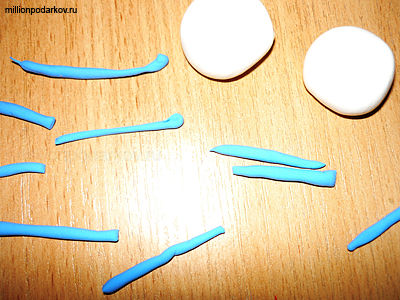 Скатайте из голубой глины несколько колбасок, а из белой 2 шарика.