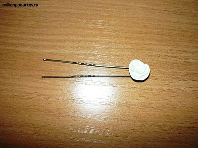 Одеваем розу на шпильку. Обрезаем оставшийся хвостик. Даем ей высохнуть в течении суток. Шпилька для невесты готова!