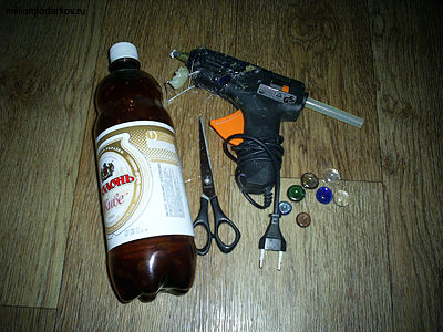 Наша поделка из пластиковой бутылки ваза была сделана из бутылок из-под пива, декоративных камешков. Также нам пригодились ножницы, свечка и клеящий термопистолет. Всего нам понадобилось две 1,5 литровые бутылки.