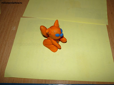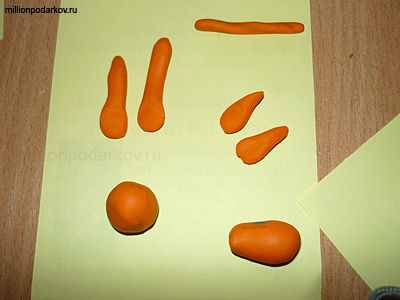 Лепи детали для нашей поделки: голову, хвост, лапы туловище и ушки из пластилина оранжевого цвета.