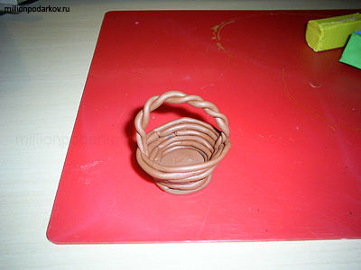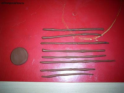 Из пластилина коричневого цвета делаем донышко корзинки. Также раскатываем тонкие колбаски. Шесть деталей нам понадобится для стенок корзинки, а две для ее ручки.
