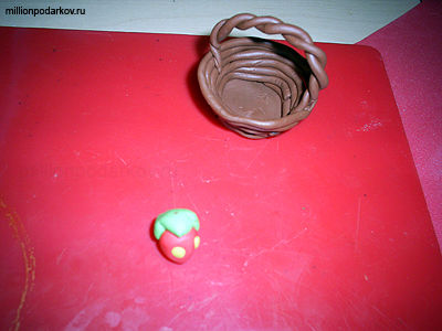 Из красного, желтого, зеленого пластилина делаем клубнички и цветочки.