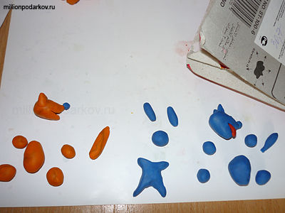 Слепите из пластилина лапы, головы, хвосты для наших будущей зверей. Лепить мы будем волка, лису и зайца.
