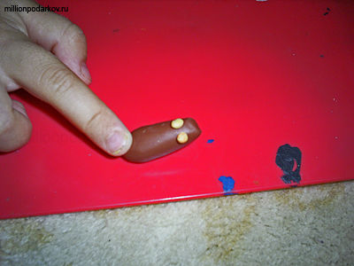 Из коричневого пластилина делаем овальное тело. Крепим белые глазки.