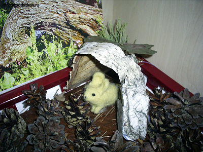 Из коры сосны и бересты делаем домик, склеивая кусочки дерева с помощью клеящего термопистолета. Там может жить, например, вот такая мышка из шерсти.