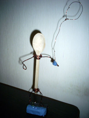 Теперь начинаем делать из всего этого человечка. Формируем ему ножки и ручки. Если проволока не держит вес столового прибора, попробуйте еще и обмотать ее вокруг туловища. Теперь осталось пофантазировать насчет сюжета. Можно дать человечку в руки проволочный «воздушный шарик» или сделать ему компаньона. Мелкие детали попробуйте прикрепить пластилином. Такие поделки из проволоки могут оригинально украсить ваш праздничный стол. Представьте только, какие глаза будут у гостей, когда возле тарелок они обнаружат вместо стандартных столовых приборов подобное чудо!