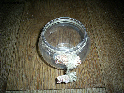 Обвязываем баночку отрезом нитки и привязываем к ее концам две ракушки, просто обмотав нитку вокруг них и завязав ее.