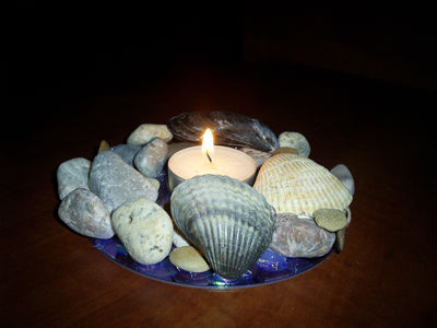 На блестящую сторону диска приклеиваем дары природы в художественном беспорядке. Для этих целей лучше всего использовать горячий клеящий пистолет, заправленный палочками из силикона. Так работа будет проходить быстрее. Но можно воспользоваться и клеем «Момент» и даже ПВА. Оставляйте посередине отверстие для свечи. Лучше всего для такого подсвечника использовать чайную свечку. Готовое изделие по желанию можно покрыть лаком. Тогда оно будет более прочным. Кроме этого подсвечник можно покрасить и акриловыми красками, но лучше всего будет смотреться натуральный природный цвет. Такие поделки из ракушек достойно украсят ваше жилище или превратятся в подарок-сюрприз для близких вам людей.