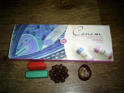 Свяжем для нашего лыжника шапочку из ниток или сошьем ее из кусочка ткани. Нарисуем лицо на каштане акриловыми красками. Сделаем из картона лыжи, руки и палки лыжника.