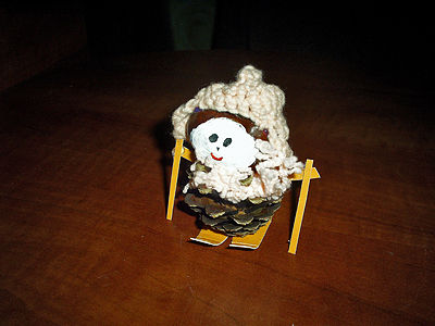 Из сосновой шишки можно сделать симпатичного человечка, например лыжника. Для этого вам понадобится еще и пластилин, каштан, клей, нитки для шапочки, акриловые краски, кусочек картона.