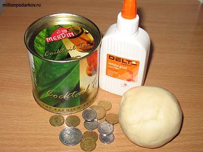 Приготовим исходные материалы: соленое тесто, старую картонную банку, монеты разной формы, клей ПВА.