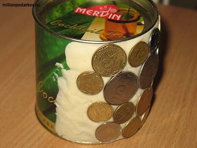 Поверхность банки немного смазать клеем ПВА и нанести слой теста. Пока тесто влажное, приклеивать к нему монеты, просто вдавливая их в тесто, поэтому работу нужно выполнять частями.