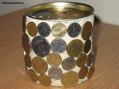 Обклеить всю банку тестом и монетами, приклеить монеты на крышку копилки. Хорошо высушить при комнатной температуре.
