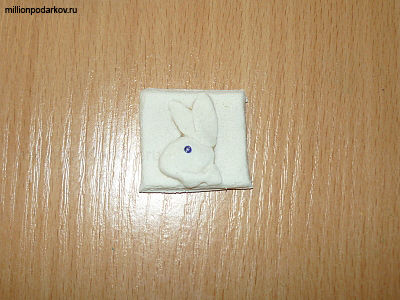 Лепим из соленого теста основу для магнита в виде зайчика Playboy. На место, где у зайчика будет глазик аккуратно помещаем синею бисеринку. Затем сушим изделия на воздухе, можно около батареи.