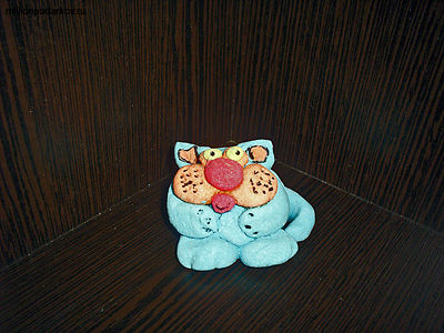 Лепим уши и мордочку котика. Для щек и глаз возьмем  оранжевое тесто, а для носа и рта – красное. Теперь сушим изделие при комнатной температуре. Черным маркером нарисуем зрачки глаз, обведем ушки. Такого котика можно подарить друзьям к новому 2011 году.