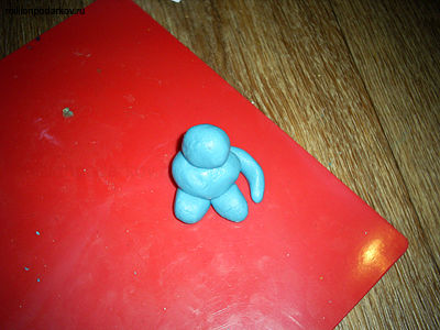 Итак, теперь приступаем к изготовлению кота. Из голубой массы делаем туловище, лапы, хвост и голову.