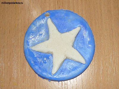 Лепим из теста медаль. Для этого раскатываем тесто на доске, затем стаканом выдавливаем круг. После этого лепим звездочку и кладем аккуратно в центр круга. Делаем в тесте отверстие, для того, чтобы потом можно было медаль подвесить на цепочку. После того, как изделие слеплено мы помещаем его в духовку, разогретую до 50 градусов, и выпекаем там в течении 1,5 часов.