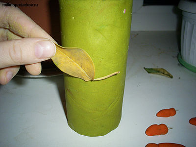 Чтобы вазочка получилась более интересной, возьмем листочек и начнем аккуратно прикладывать его к вазочке так, чтобы получились отпечатки.