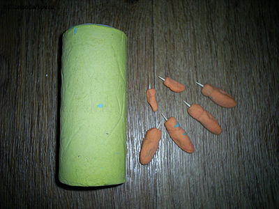 Теперь из оранжевого соленого теста лепим пчелок. Для этого из кусочка массы делаем овальную деталь, затем стеком отделяем голову от брюшка. Отламываем кусочек зубочистки с острием и вставляем в середину головы, формируя жало пчелы. Оставляем поделку сохнуть при комнатной температуре на 1-2 суток.