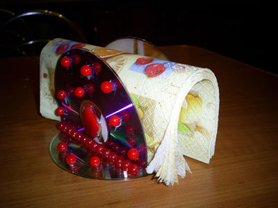 Когда клей высохнет, приступим к украшению нашей поделки из старых компакт дисков. Для этого можно воспользоваться ненужными бусами. Закрываем ими некрасивый стык и хаотично клеем по поверхности. В результате получается вот такая чудесная салфетница. Теперь вы видите, что даже не нужные материалы могут обрести новую жизнь, превратившись в красивые и практичные вещицы.