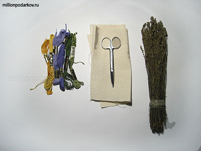 Приготовьте материалы. Нитки для вышивки нужны для украшения мешочка. Если вы не умеете вышивать - декорируйте саше готовыми аппликациями, кружевами, бусинами на ваш вкус.