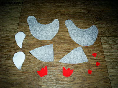 Теперь переносим выкройку на фетр и картон и вырезаем все необходимые детали. Если картон не двухсторонний, половинки гребешка, клюва склеиваем.