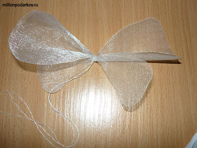 Вырезаем из тафты крылышки. Затем обжигаем их зажигалкой, чтобы ткань не сыпалась. После этого связываем крылышки ноткой.