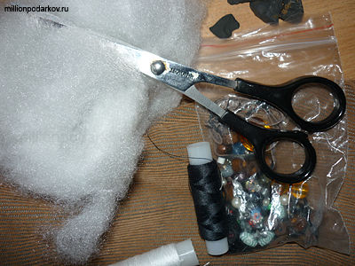 Для того, чтобы сшить такой брелок вам потребуется: шунгит (его можно купить в любой аптеке, стоит около 100р. за пачку), ткань вельветовая светло-коричневого и темно-коричневого цветов, нитки белые, черные, иголка, бусины, кожаный шнурок, синтепон.