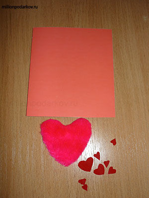 Вырезаем из картона основу для открытки и сворачиваем её пополам, затем из меховой ткани вырезаем большое сердечко, а из бархатной бумаги маленькие сердечки.