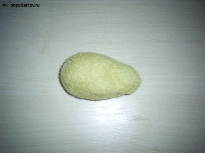 Благодаря энергичным движениям специальной иглы шерсть сваливается. Для того чтобы обозначить на изделии выемки, в этих места больше работаем иглой, а для выпуклостей добавляем еще шерсти и приваливаем ее к поделке в нужном месте. Вот мы и сформировали тело и голову мышки. С одного конца она заостренная, а с другого округлая. Кроме того, на границе головы и тела хорошо видна выемка.