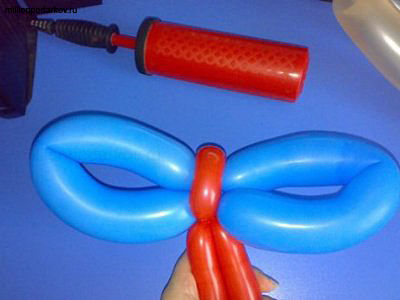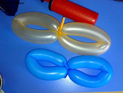 Надуваем с помощью насоса шары ШДМ, так чтобы один был больше другой меньше. Делаем из них восьмёрки, как показано на картинке. Это будут крылышки нашей бабочки.