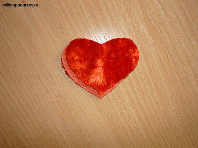 Вырезаем из ткани две половинки в форме сердечко, и сшиваем. Оставим небольшое отверстие сверху. Через него мы будим набивать сердце синтепоном.