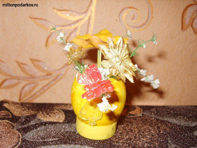 На заключительном этапе изготовления поделки «Композиция в яичной скорлупе» нужно сделать цветочки. Могут подойти как готовые цветы, которые продаются в магазинах, так и самодельные. Самими цветы сделать легко. Берете шпажку и приклеиваете к ней цветок (вырезанный из ткани или бумаги). Все цветы втыкаете в наполнитель скорлупы и делаете композицию. Поделка готова.