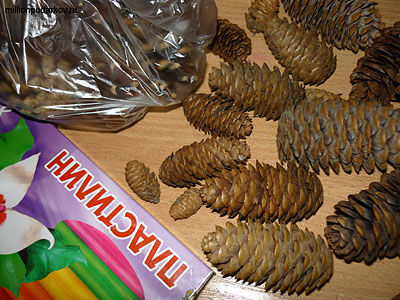 Для того, чтобы у нас получилась поделка лиса из шишек приготовьте несколько еловых шишек и пластилин.