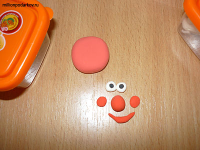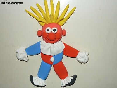 Катаем из желтой, или любой другой пластики, длинную колбаску, которую разрезаем ножом или ножницами на множество колбасок. Из них мы будем делать волосы. Когда колбасок накопилось много, приклеиваем их к голове нашего клоуна. После того, как клоун готов, мы даем ему высохнуть в течении суток. Затем приклеиваем к задней части магнит.
