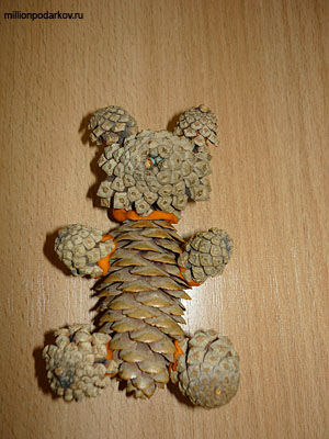 Лепим из пластилина носик, глазки, ротик и пальчики. Поделка медведь из шишек законченна!