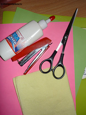Для открытки вам потребуется яркая цветная бумага, столовые салфетки, степлер, клей ПВА и ножницы.