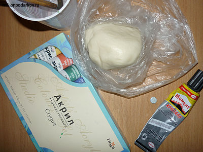 Для поделки вам потребуется магнитик, клей "Момент", акриловые краски и солёное тесто. Соленое тесто готовится так : пол стакана соли "экстра" , пол стакана муки, четверть стакана воды, и для того, чтобы темто было эластичней и хорошо склеивалось добавте пол ложки крема для рук. смешайте все ингредиенты и поместите тесто на 2 часа в холодильник. После этого из него можно будет лепить поделки.