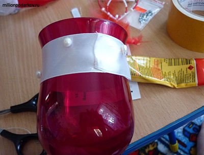 Надеваем декорационную тесьму на бокал, и закрепляем тесьму двухсторонним скотчем.