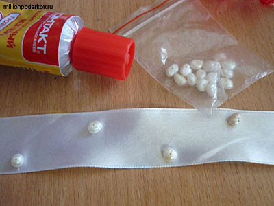 С помощью контактного клея приклейте жемчуг к атласной ленте.