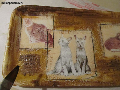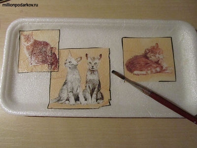 Вырезаем из салфетки подходящие сюжеты, отделяем верхний красочный слой и приклеиваем к тарелочке. Получается декупаж.