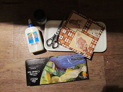 Для того чтобы сделать тарелочку в стиле декупаж, нам понадобятся такие материалы, как трехслойная салфетка с котиками, пенопластовая тарелочка, ножницы, клей ПВА, акриловые краски, кисточка и лак.