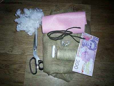 Для того чтобы сделать поделку своими руками домовенок, нам понадобились такие материалы, как мешковина, фетр розовый, шерстяные нитки, ножницы, холлофайбер, тесьма, сувенирные деньги, иголка, нитки, глазки.