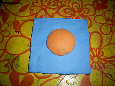 Кусочек пластилина желтого или оранжевого цвета катаем в шарик и сплющиваем его. Приклеиваем к небу.
