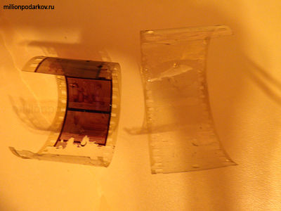 Чтобы приготовить основание нужно стереть изображение мультика или фильма со старой пленки с помощью ножниц и мыла. Вот, что будет