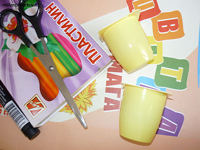 Для того, чтобы у нас получилась поделка "Тигр" нам потребуется 2 маленьких стаканчика от растишки, пластилин, цветная бумага, ножницы, черный маркер.